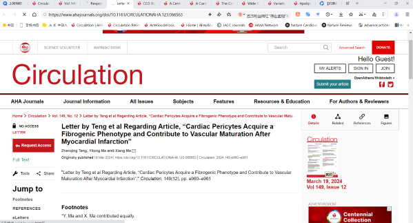 新疆医科大学心血管疾病中心团队马依彤教授和马翔教授指导的博士生在心血管领域权威期刊Circulation 连续第五次发表评论文章 "Letter by Teng et al Regarding Article, “Cardiac Pericytes Acquire a Fibrogenic Phenotype and Contribute to Vascular Maturation After Myocardial Infarction”"。该文章对近期的一项有关“心肌梗死后心脏周细胞获得纤维生成表型并促进血管成熟的原创性研究”进行思考、建议与补充。文章内容得到国际、国内心血管专家认可,已于2024年3月19日在Circulation杂志官网发表。