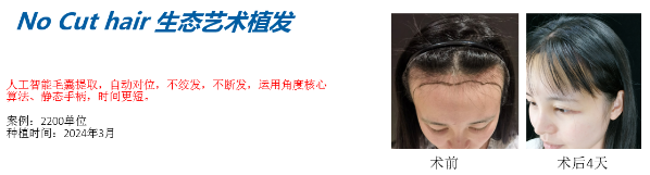 No Cut hair生态艺术植发是由米兰柏羽北京丽都医疗美容医院马建民主任在传统的不理发技术基础上,升级应用人工智能算法医用手术动力系统嵌入式软件V1.1.0.0,实现精准的长发提取技术,并结合了北京米兰柏羽丽都独创丽都新美学“四庭七眼”实出了更精细的长发艺术种植。