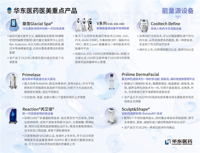 华东医药聚焦全球医美高端市场,产品管线多样化。目前,华东医药已拥有“微创+无创”医美国际化高端产品40款,其中海内外已上市产品达26款,在研全球创新产品14款,已形成综合化产品集群,产品数量和覆盖领域均居行业前列。在注射类产品实现再生类、玻尿酸、肉毒素三大品类的全覆盖,每个品类均已形成两个以上差异化产品管线。