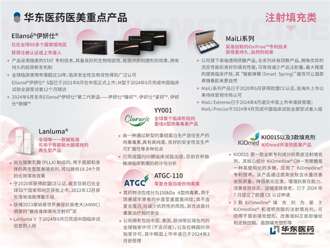 另一方面,通过自主创新研发,华东医药不断推进高端医美产品在全球的临床和商业化进展。2024年7月,华东医药旗下MaiLi®透明质酸填充剂新加坡成功举办上市会,此外,MaiLi系列多款产品均在国内快速推进临床。MaiLi Extreme的注册申请于2024年4月获得国家药监局器审中心受理,有望于2025年在国内获批上市。