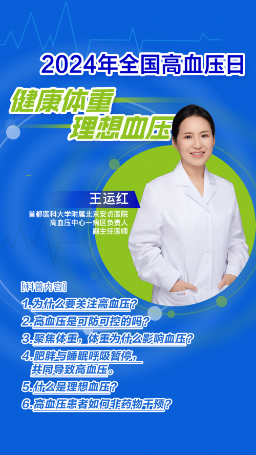 为进一步普及科学的高血压疾病防治知识,帮助公众正确认识高血压,科学防范高血压,倡导健康生活方式,北京市卫生健康委员会邀请首都医科大学附属北京安贞医院、高血压中心——病区负责人、副主任医师王运红医生和大家分享了高血压和肥胖的关系以及会给健康带来的影响。